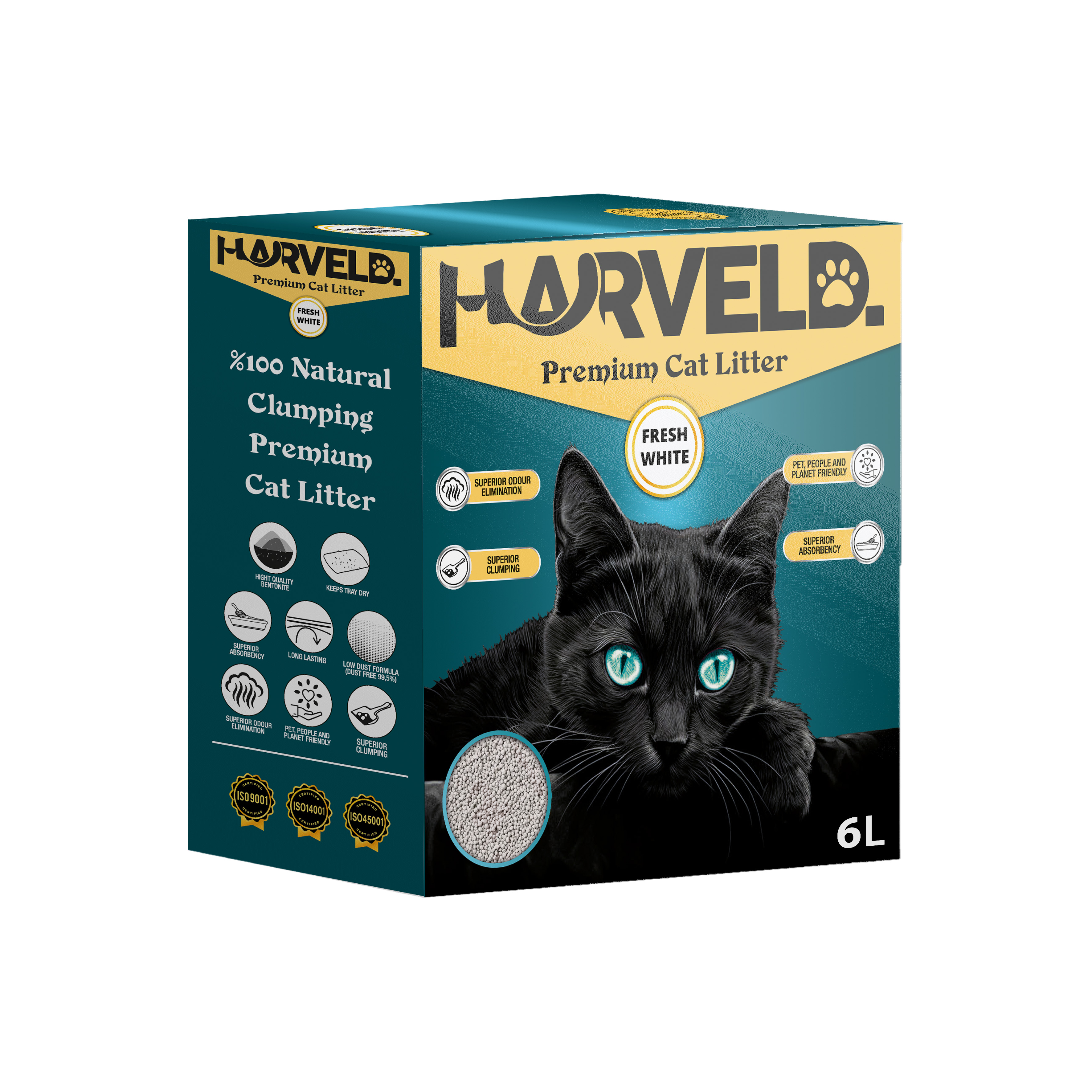 Harveld Fresh White 6L is a premium bentonite cat litter with an unscented formula, a high clumping rate, and an extra dust-free composition. It is the perfect choice to ensure your cat's hygiene and comfort.