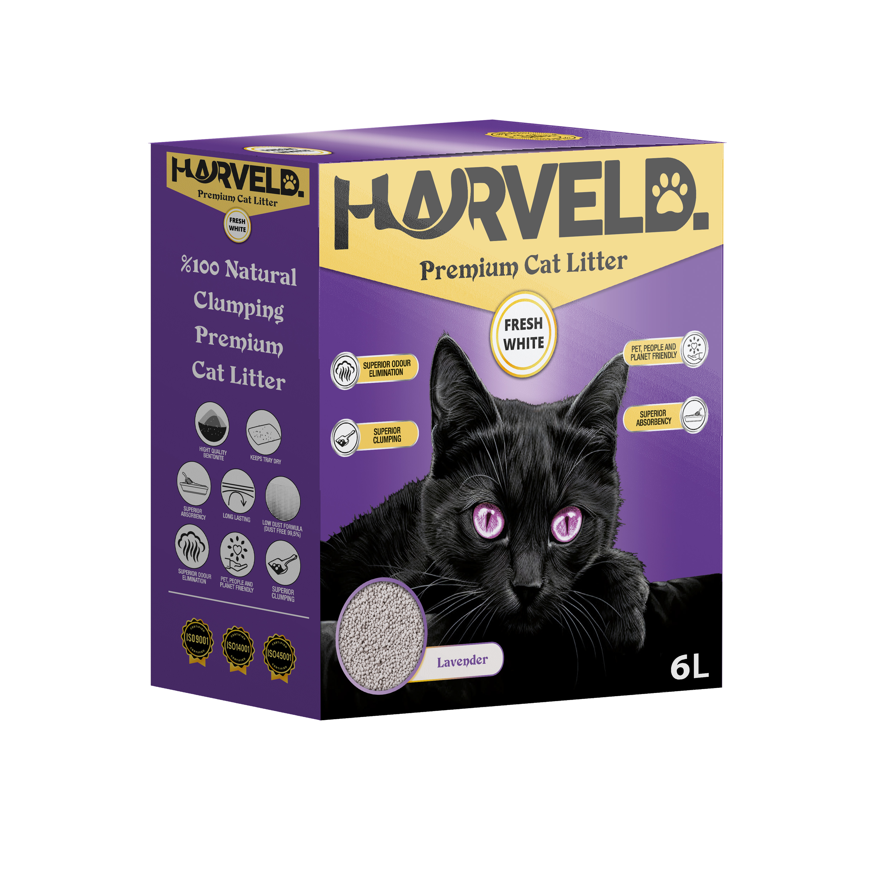 Harveld Fresh White Lavender 6L is a premium bentonite cat litter with a lavender scent, high clumping ability, and an extra dust-free formula, designed to ensure your cat’s hygiene and comfort.