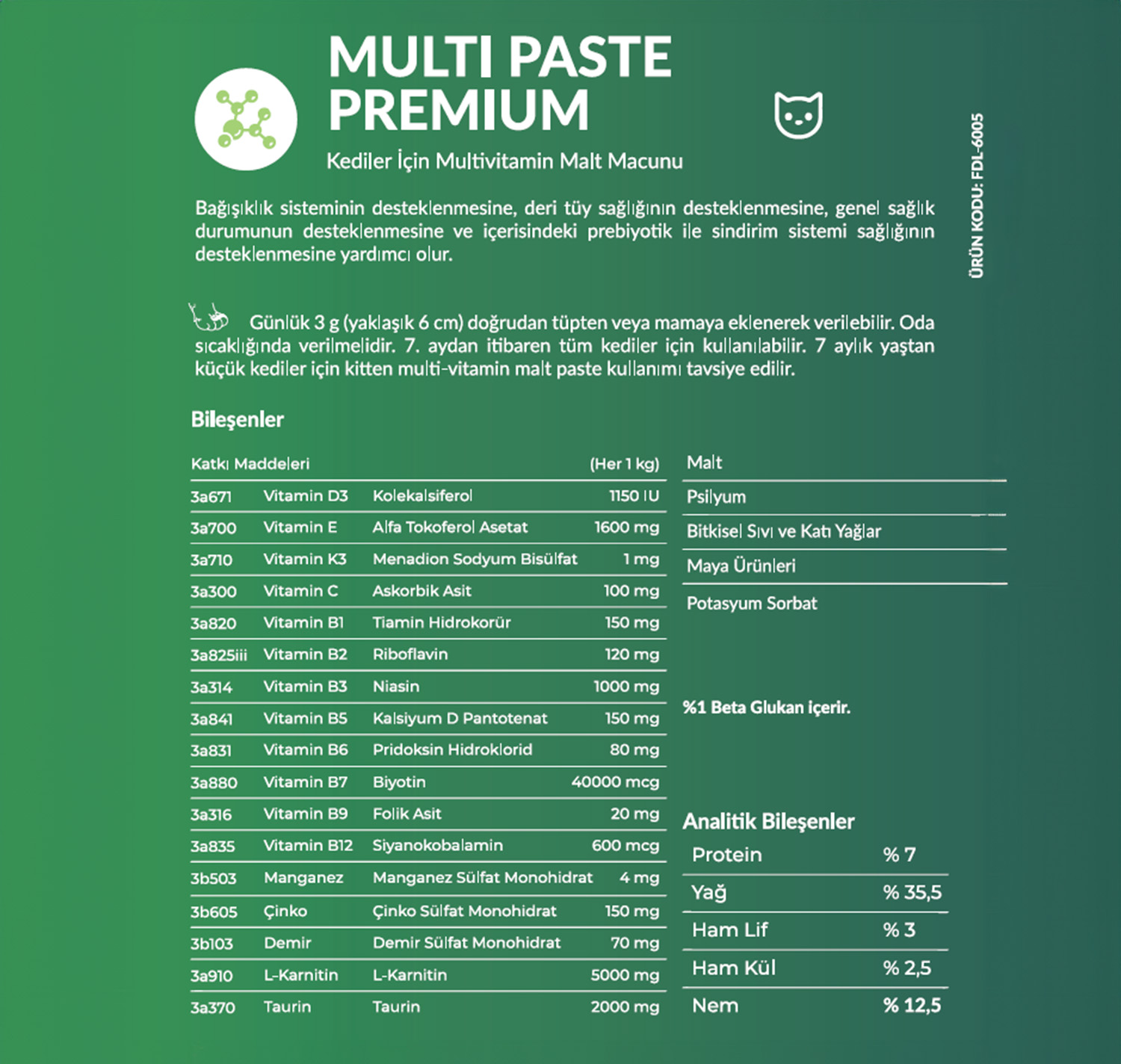 This paste supports the immune system, enhances skin and fur health, boosts overall well-being, and promotes digestive health with prebiotics. It should be given daily at 3 g (approximately 6 cm), directly from the tube or mixed into food. Suitable for use at room temperature and for all cats over 7 months old. For cats younger than 7 months, the use of kitten multivitamin malt paste is recommended.